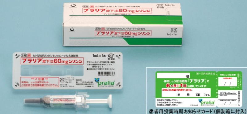 プラリアに関する重要な詳細:有効成分: デノスマブ(ヒト型IgG2モノクローナル抗体)作用機序: 破骨細胞の形成・機能・生存を制御するRANKLというタンパク質を阻害し、骨吸収を強力に抑制する。