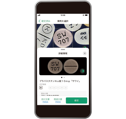 特徴: スマホで撮影した薬剤をAIが識別し、独自のマスター画像と比較して正確な名称を判定します。